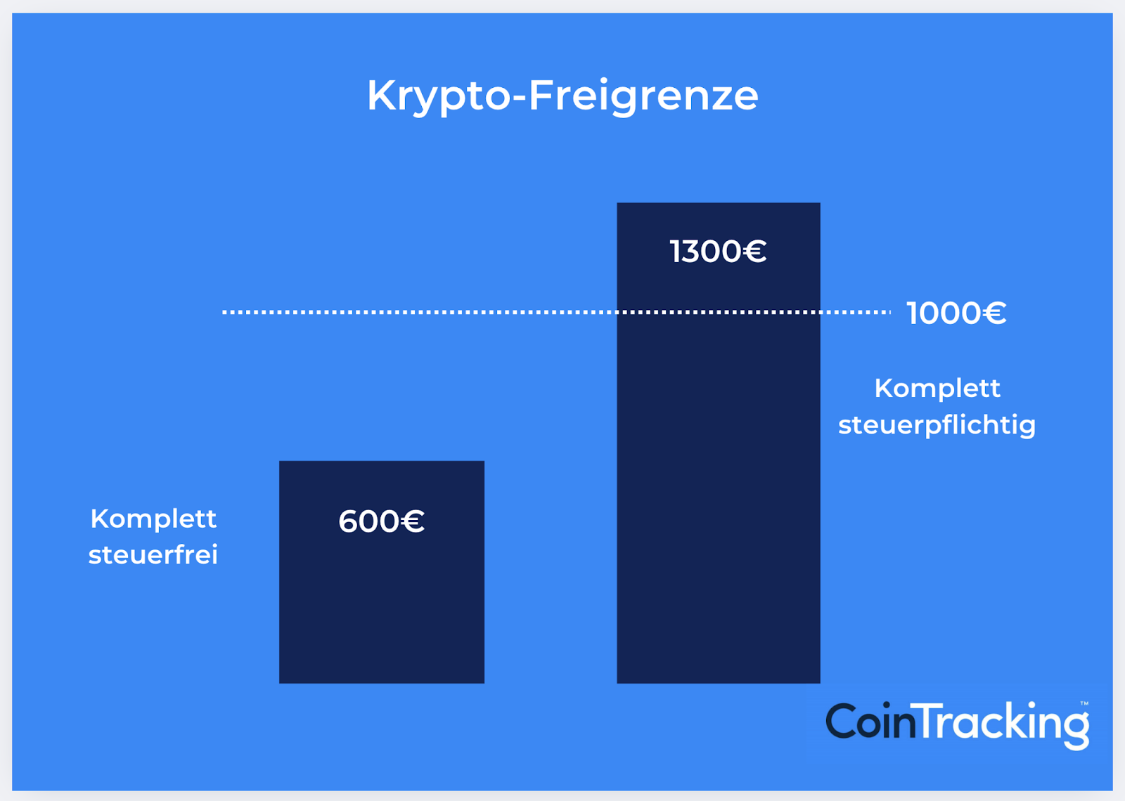 Beispiel zur Verdeutlichung: Dein Krypto-Gewinn im Jahr beträgt 1.300 € → Der komplette Betrag von 1.300 € ist steuerpflichtig, nicht nur die 300 € über der Freigrenze.